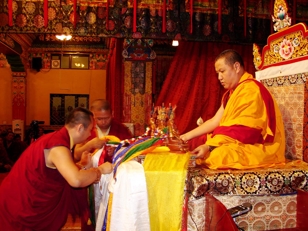 photo - 2007/10/08 - 明就仁波切、貢噶仁波切、賈敦仁波切、突托仁波切以及蔣貢康楚仁波切的總秘書和許多來自世界各地的出家眾、信眾,以由衷的謝意及敬意向尊貴的桑傑年巴仁波切獻曼達,以感謝其完成五巨寶藏之噶舉寶藏及心密藏的口傳,以及開示『大乘無上要義論』(無著菩薩論著)甚深法教。(圖文來源 :八蚌全球網路中心)