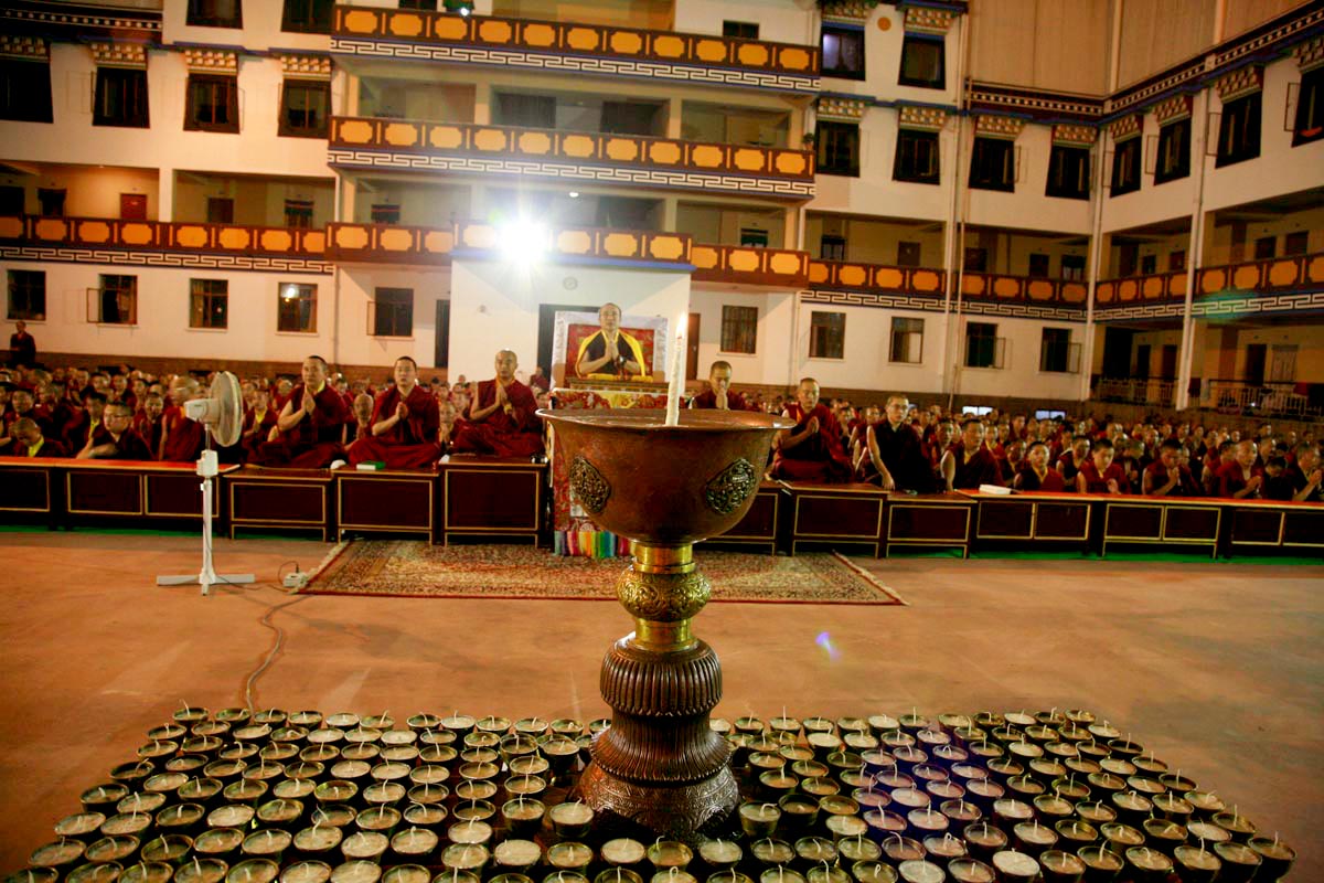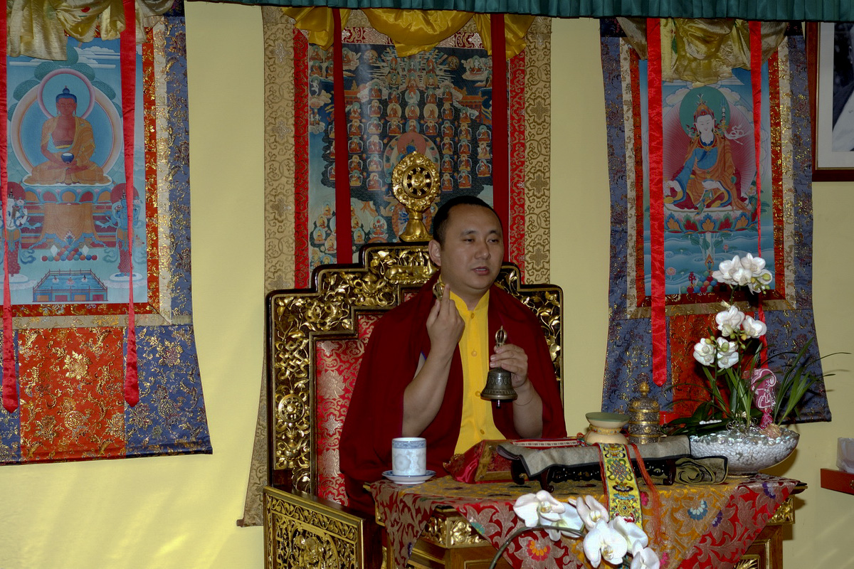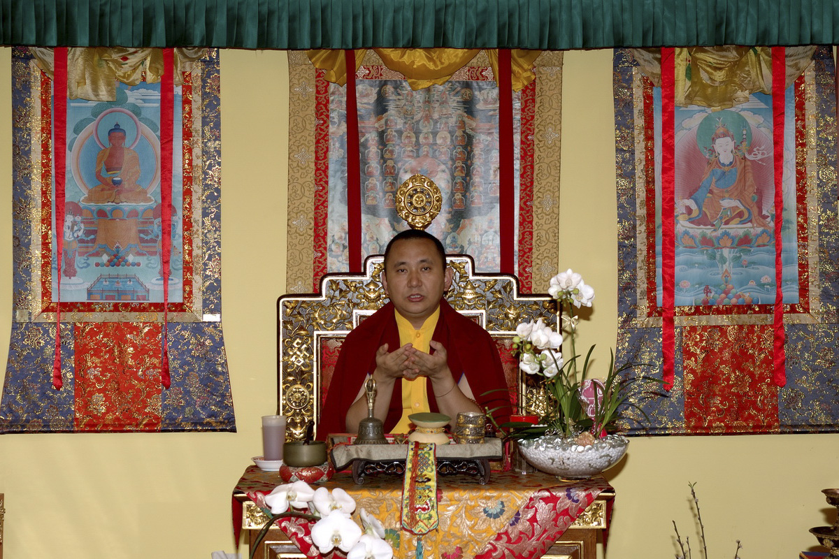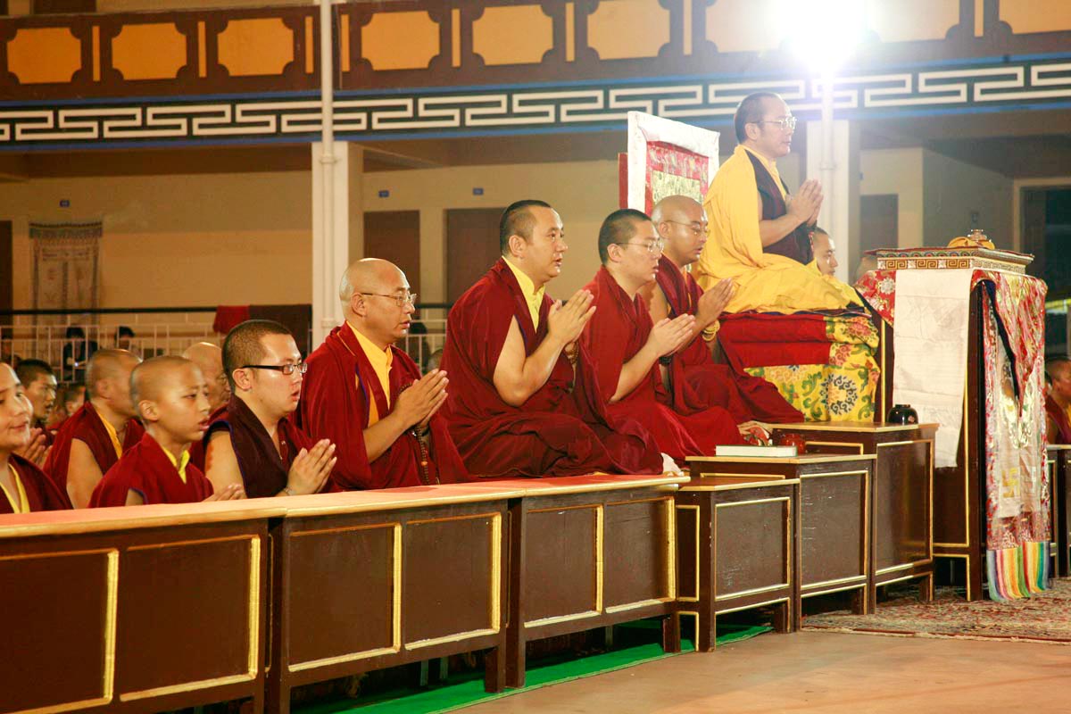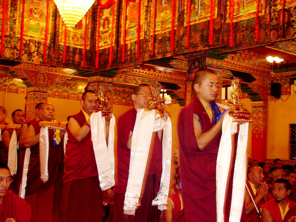 (198) 仁波切及信眾們向尊貴的桑傑年巴仁波切獻曼達:(右起)貢噶仁波切,賈敦仁波切,突托仁波切(2007/10/08)