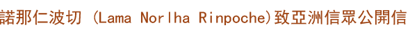 我過去以來在北美以及亞洲地區所做的努力,已經利益了無數的眾生,並傳揚了佛陀的法教,我已得到第十六世大寶法王噶瑪巴、寧瑪傳承的上師們包括恰扎仁波切(Chatral Rinpoche)、赤列諾布仁波切(Tinley Norbu Rinpoche)、和敏林赤千仁波切(Minling Trichen)等上師認證我是諾那呼圖克圖活佛(Kham Riwoche Norlha Rinpoche)的轉世,為了不辜負這個榮譽,我已經在西藏的康地類烏齊區(Riwoche)興建了諾那活佛紀念塔,這座佛塔以銅和金材質製作,這些金和銅的佛塔受到竹巴噶舉傳承的康珠仁波切(Khamtrul Rinpoche)以及噶瑪恰美仁波切(Karma Chagme Rinpoche)讚嘆。類烏齊區邀請我到該寺慶祝我得到認證,今年我因生病無法前往,等明年我的健康恢復一定前往。
